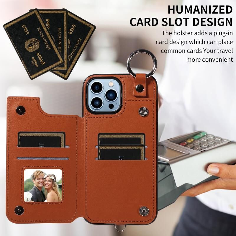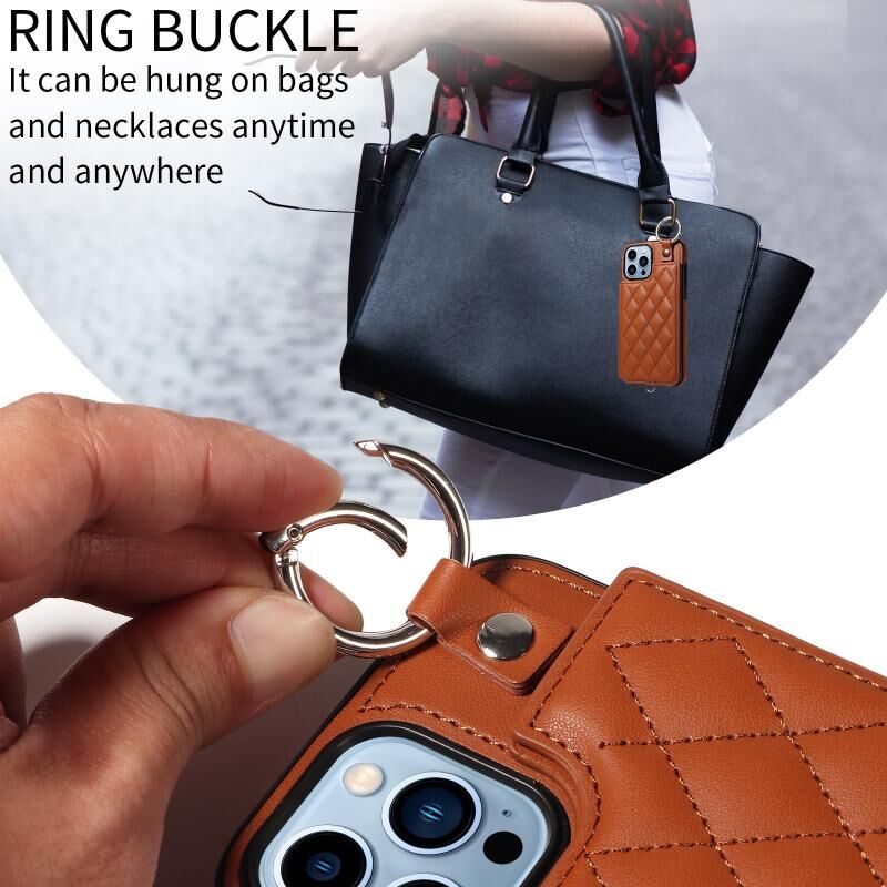 For iPhone 13 Pro Max Rhombic Texture Card Bag Phone Case with Short Lanyard(Brown)