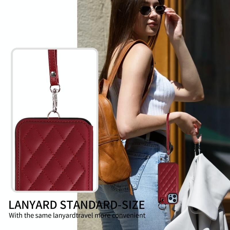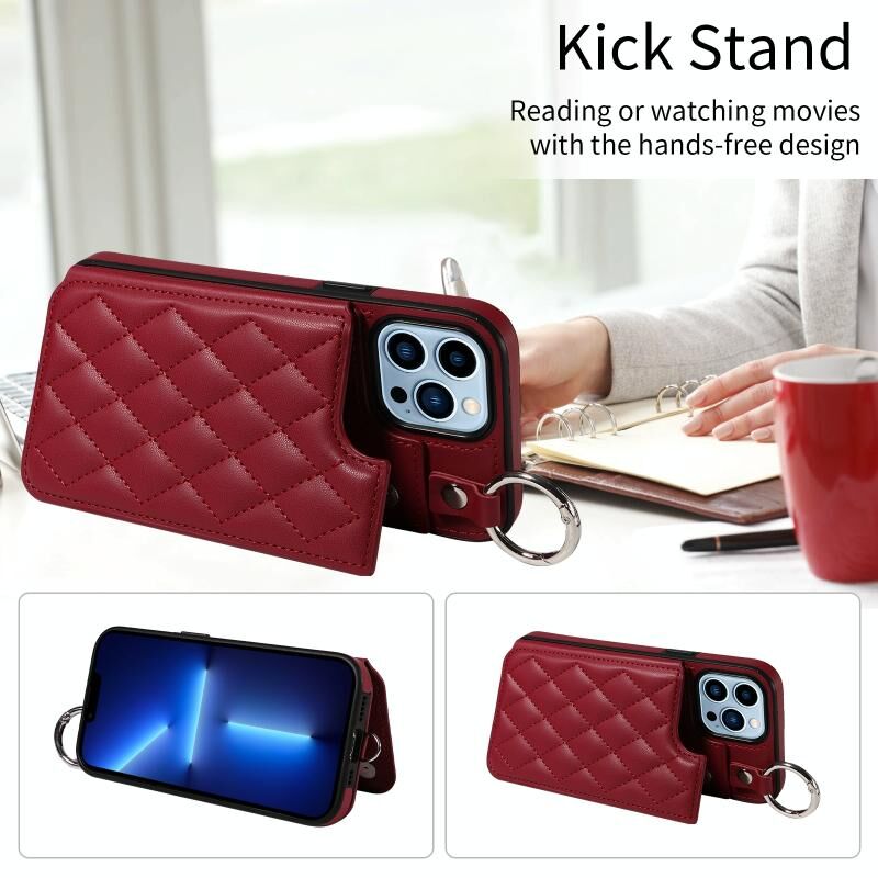 For iPhone 13 Pro Max Rhombic Texture Card Bag Phone Case with Short Lanyard(Wine Red)