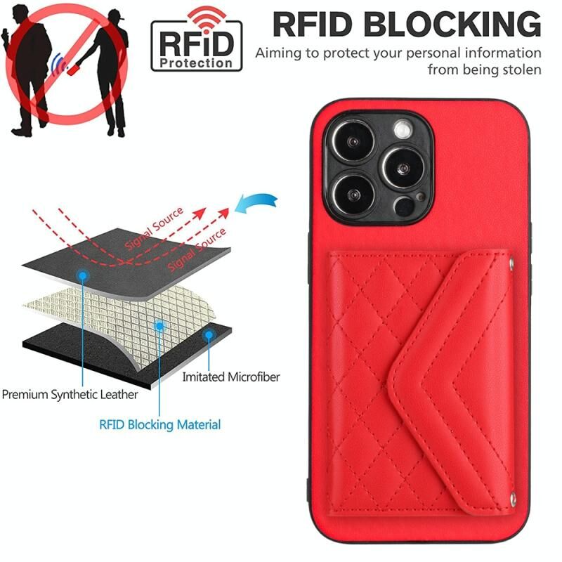 For iPhone 13 Pro Max Rhombic Texture Card Bag RFID Phone Case with Long Lanyard(Red)