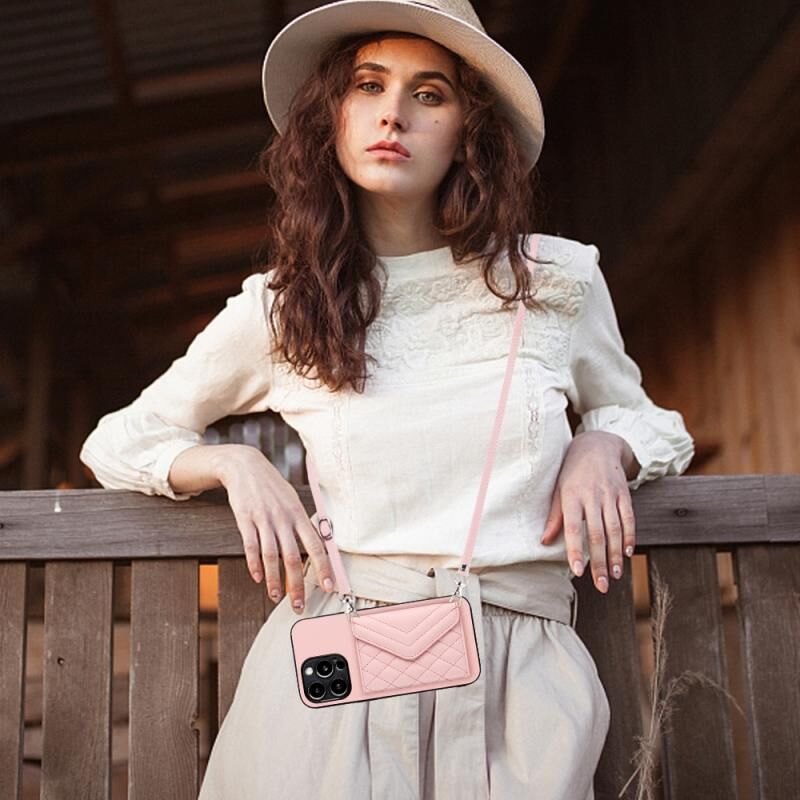 For iPhone 13 Pro Max Rhombic Texture Card Bag RFID Phone Case with Long Lanyard(Rose Gold)