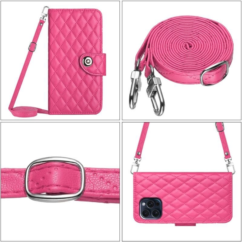 For iPhone 13 Pro Max Rhombic Texture Flip Leather Phone Case with Long Lanyard(Rose Red)