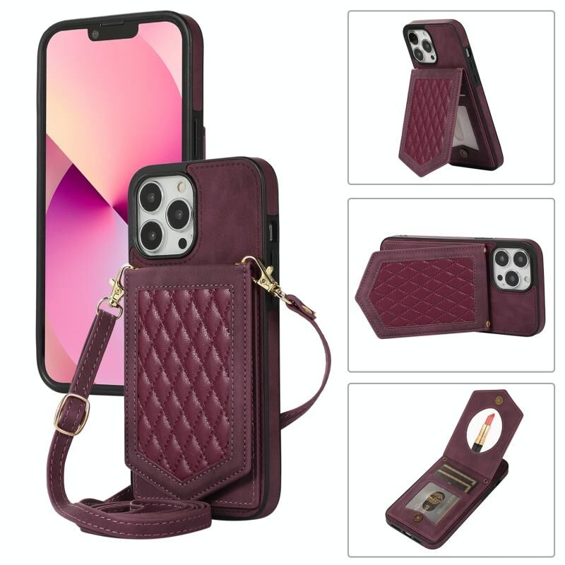 For iPhone 13 Pro Max Rhombic Texture RFID Phone Case with Lanyard & Mirror(Wine Red)
