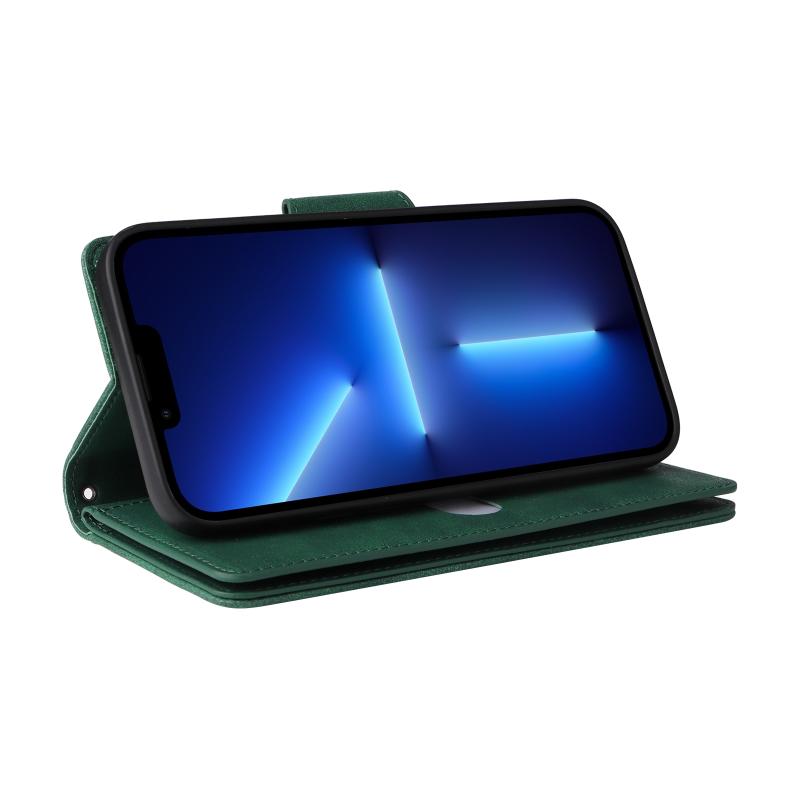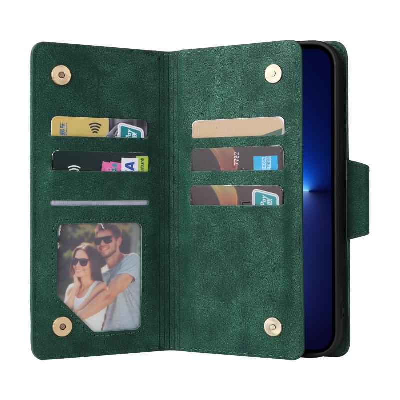 For iPhone 13 Pro Max Rivet Buckle 9 Cards Three Fold Leather Phone Case (Green)
