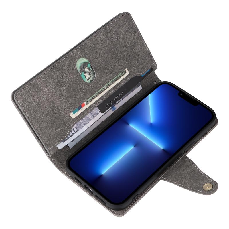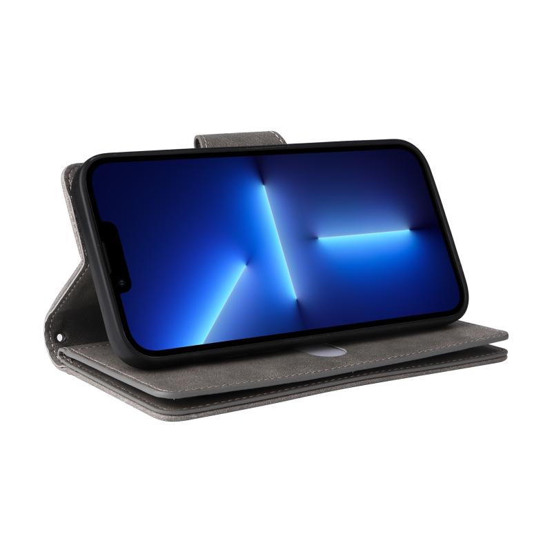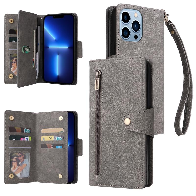 For iPhone 13 Pro Max Rivet Buckle 9 Cards Three Fold Leather Phone Case (Grey)