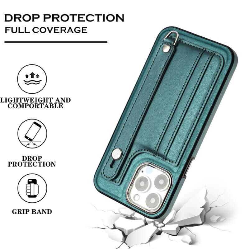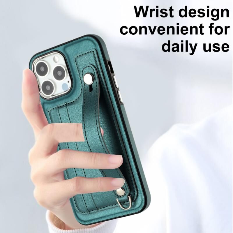 For iPhone 13 Pro Max Shockproof Leather Phone Case with Wrist Strap(Green)