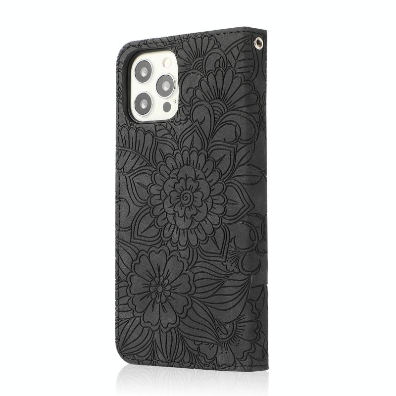 For iPhone 13 Pro Max Skin Feel Embossed Sunflower Horizontal Leather Case (Black)
