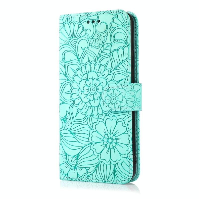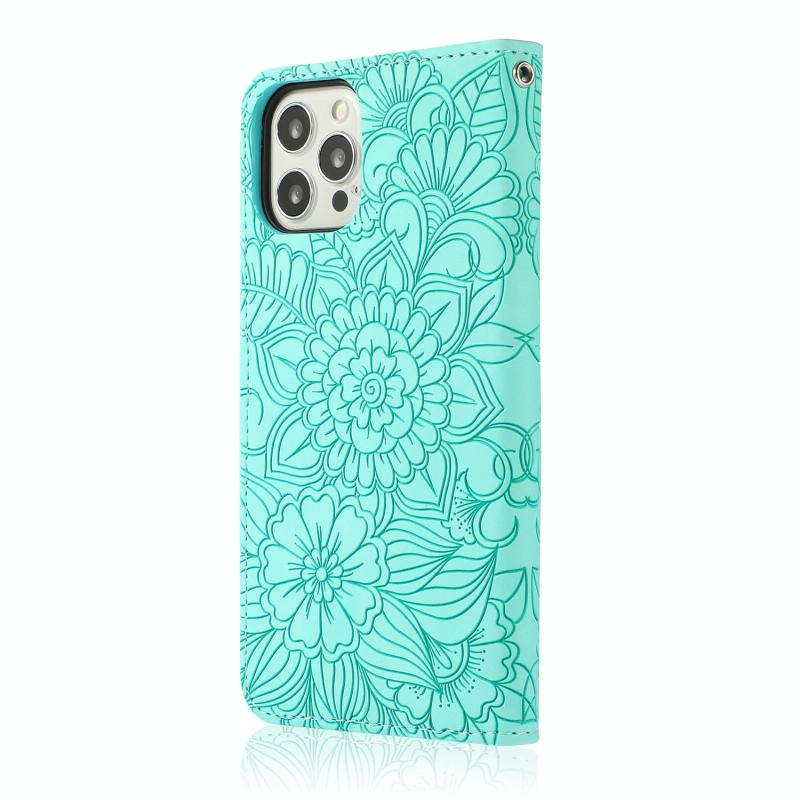 For iPhone 13 Pro Max Skin Feel Embossed Sunflower Horizontal Leather Case (Green)