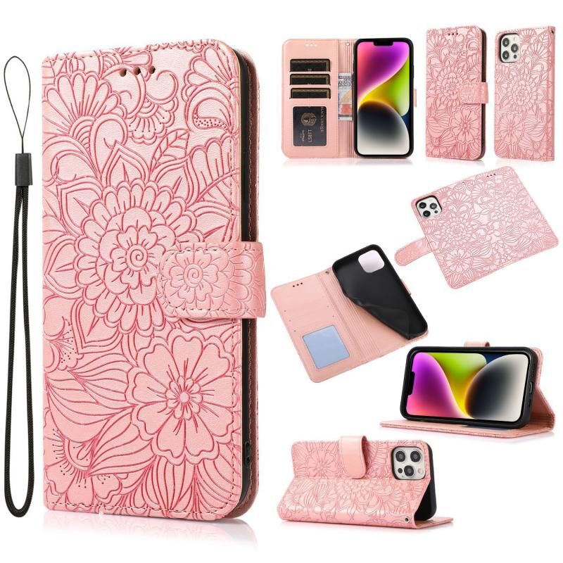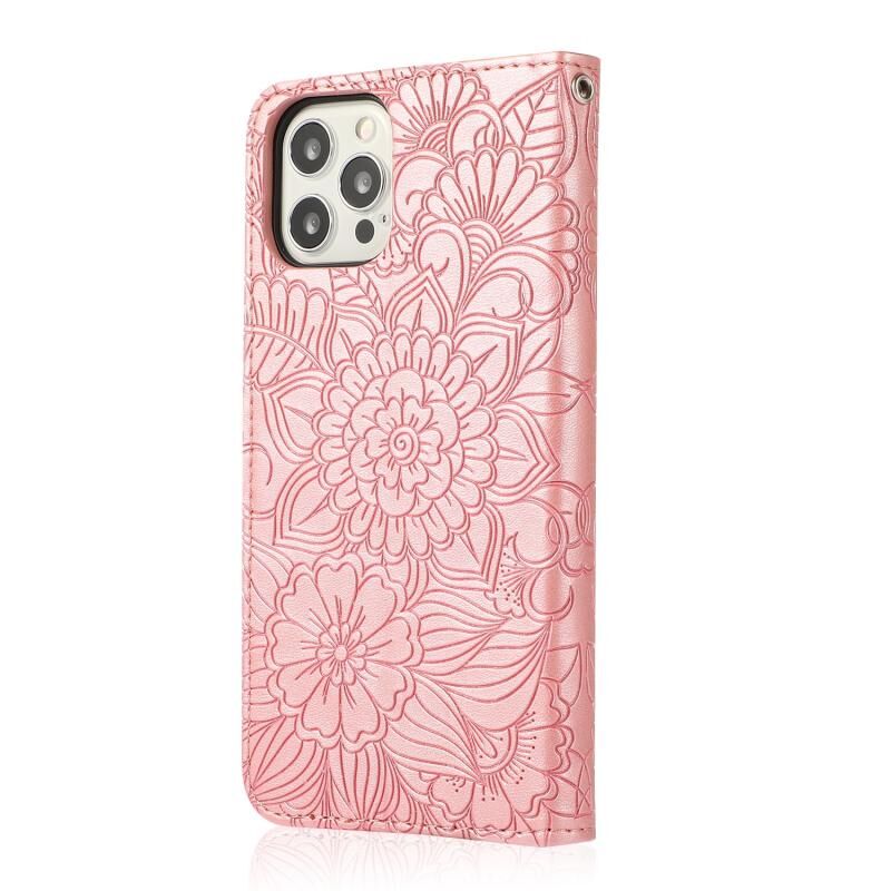 For iPhone 13 Pro Max Skin Feel Embossed Sunflower Horizontal Leather Case (Rose Gold)