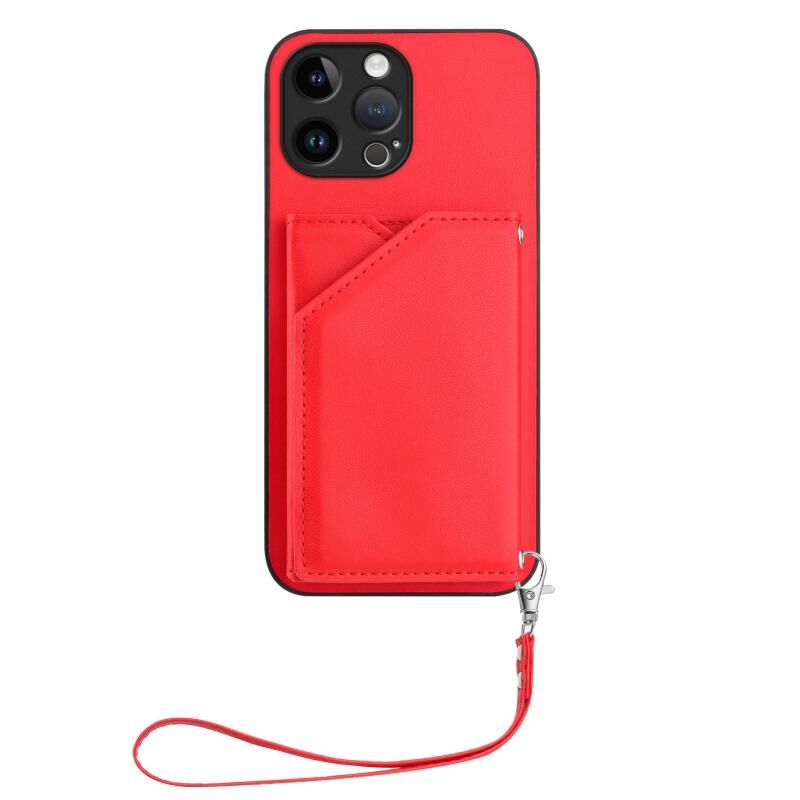 For iPhone 13 Pro Max Skin Feel Four Card Slots Phone Case with Wrist Strap(Red)