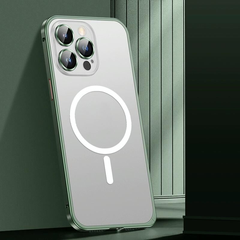 For iPhone 13 Pro Max Spring Buckle Metal Frosted Magsafe Phone Case(Green)