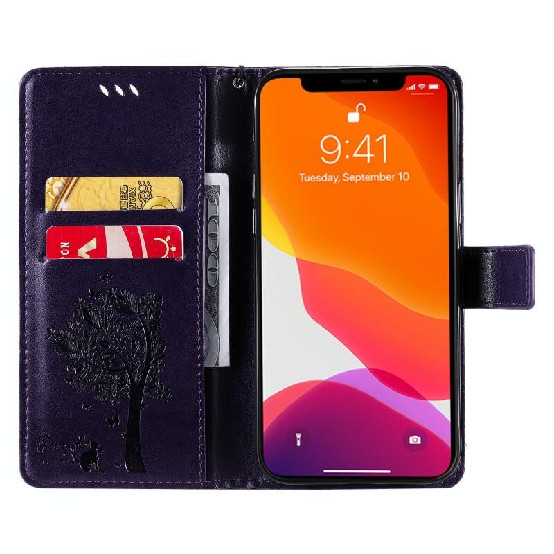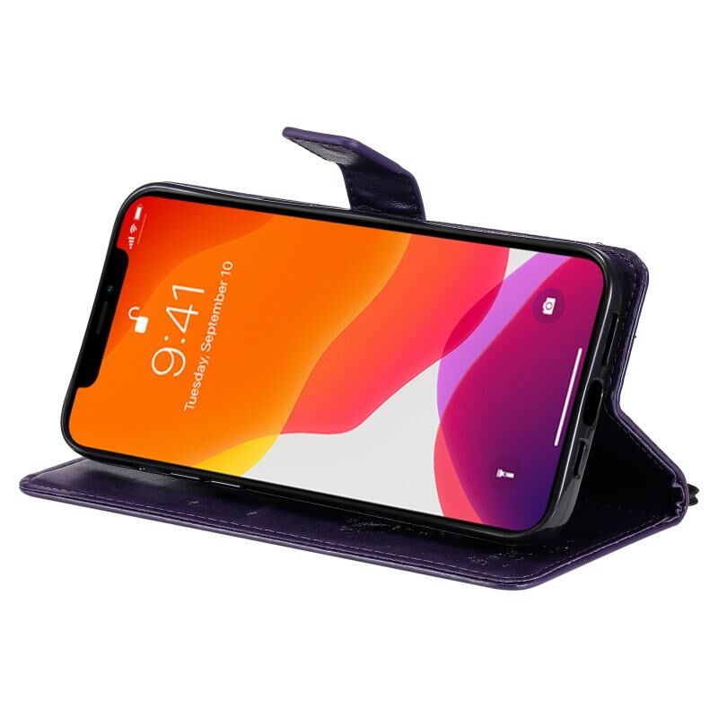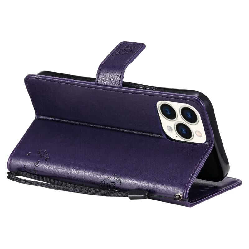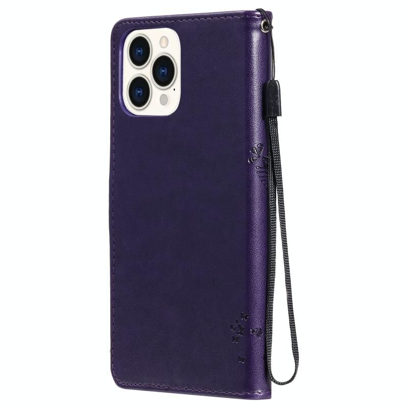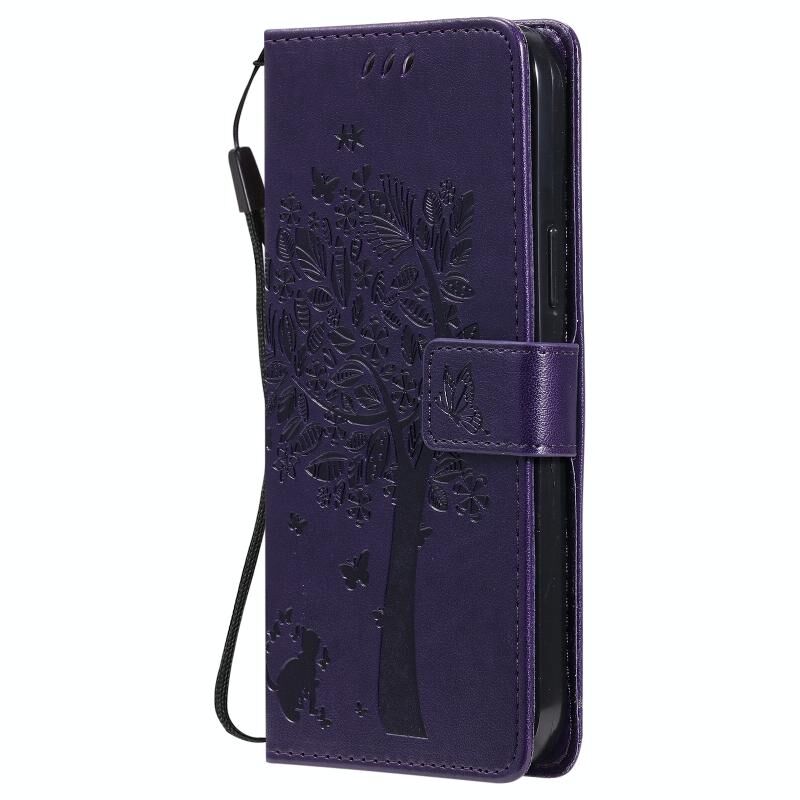 For iPhone 13 Pro Max Tree & Cat Pattern Pressed Printing Horizontal Flip PU Leather Case with Holder & Card Slots & Wallet & Lanyard (Purple)