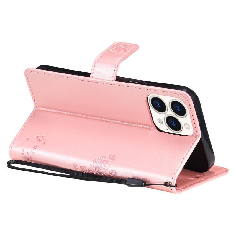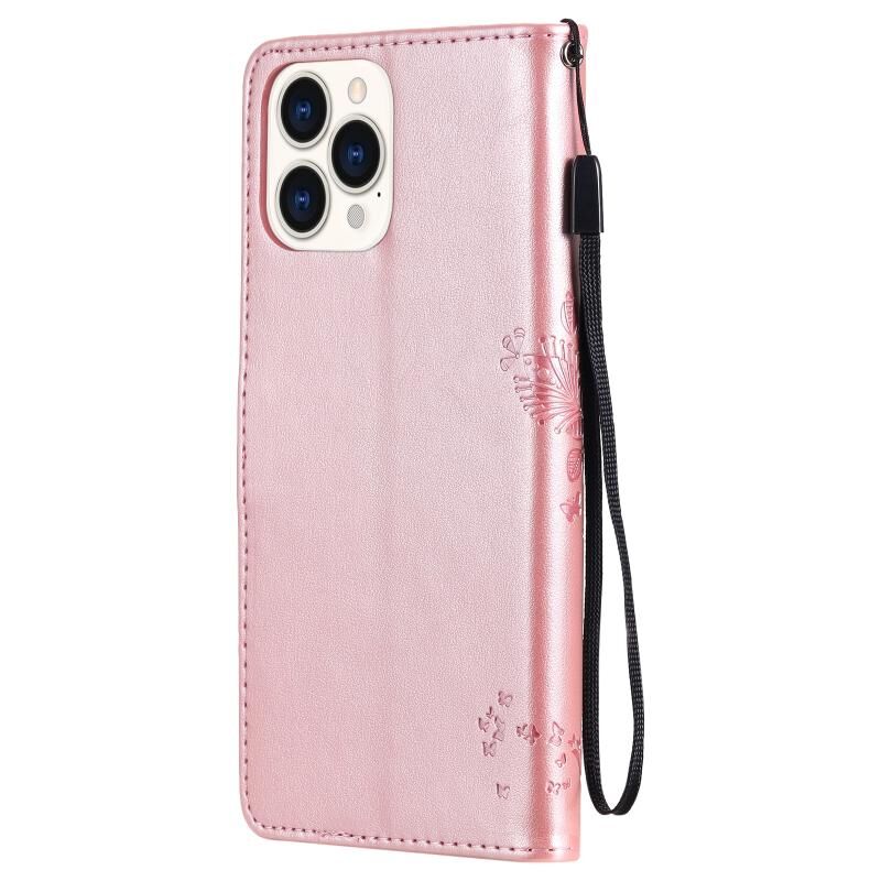 For iPhone 13 Pro Max Tree & Cat Pattern Pressed Printing Horizontal Flip PU Leather Case with Holder & Card Slots & Wallet & Lanyard (Rose Gold)