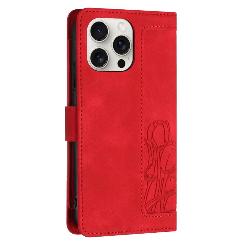 For iPhone 13 Pro Max Tulips Embossed Leather Phone Case with Lanyard(Red)