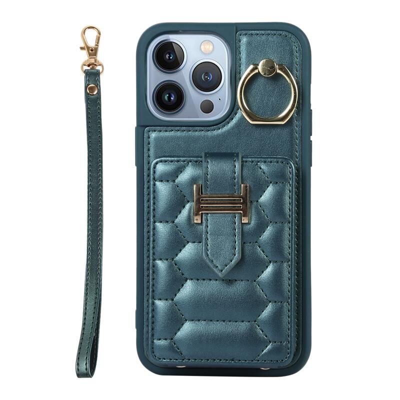 For iPhone 13 Pro Max Vertical Card Bag Ring Holder Phone Case with Dual Lanyard(Dark Green)