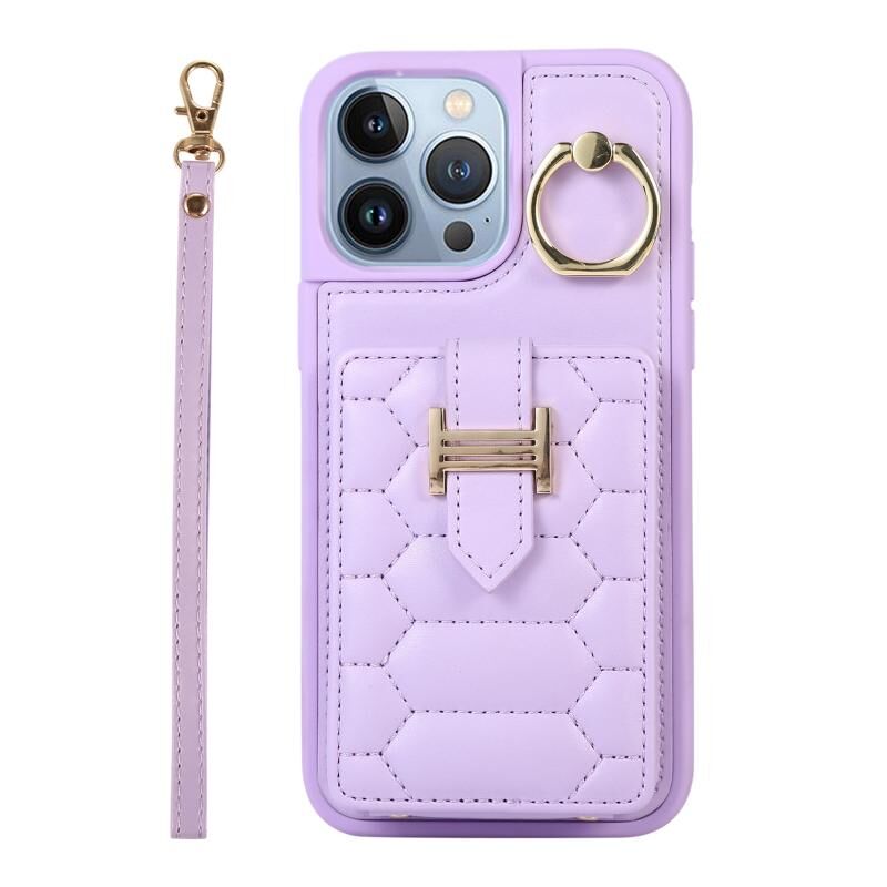 For iPhone 13 Pro Max Vertical Card Bag Ring Holder Phone Case with Dual Lanyard(Purple)