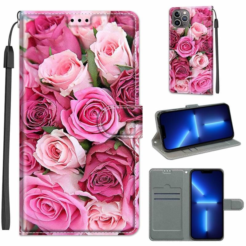 For iPhone 13 Pro Max Voltage Colored Drawing Magnetic Clasp Horizontal Flip PU Leather Case with Holder & Card Slots (C17 Green Leaf Pink Rose)