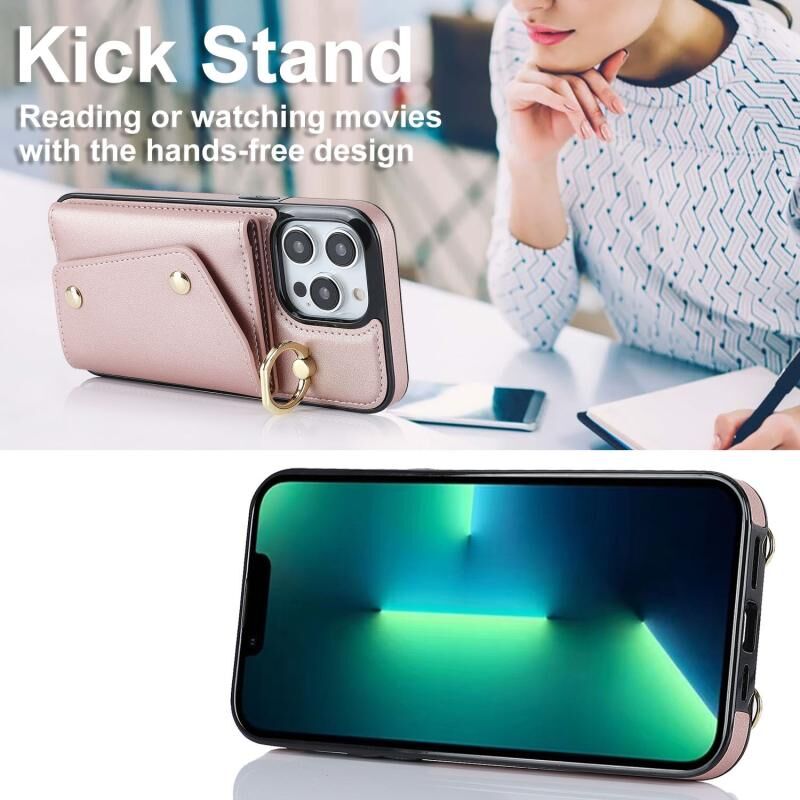 For iPhone 13 Pro Max Zipper Card Bag Phone Case with Dual Lanyard(Rose Gold)
