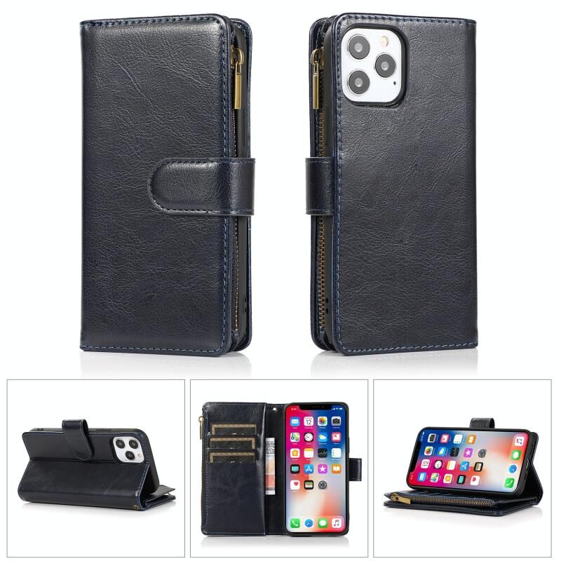 For iPhone 13 Pro Multifunctional Crazy Horse Texture Horizontal Flip Leather Case with 9 Card Slot & Holder & Zipper Wallet & Lanyard (Blue)