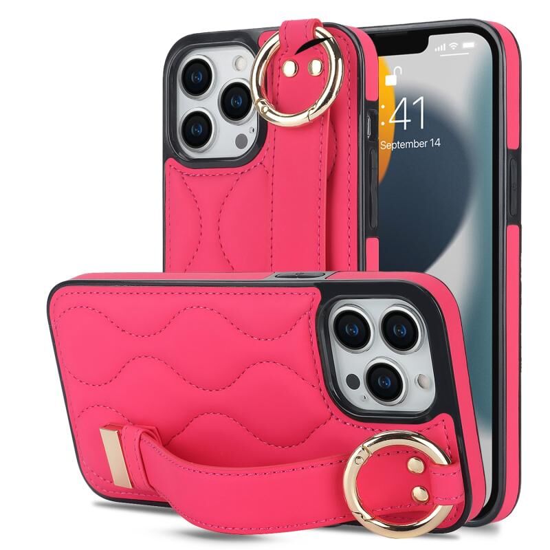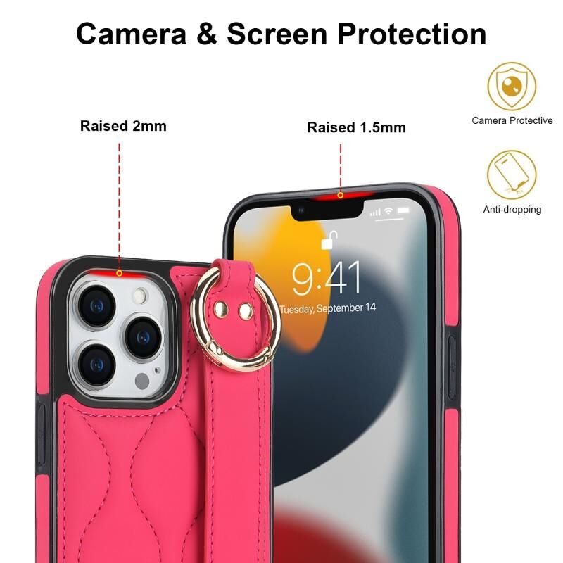 For iPhone 13 Pro Non-slip Full Coverage Ring PU Phone Case with Wristband(Rose Red)