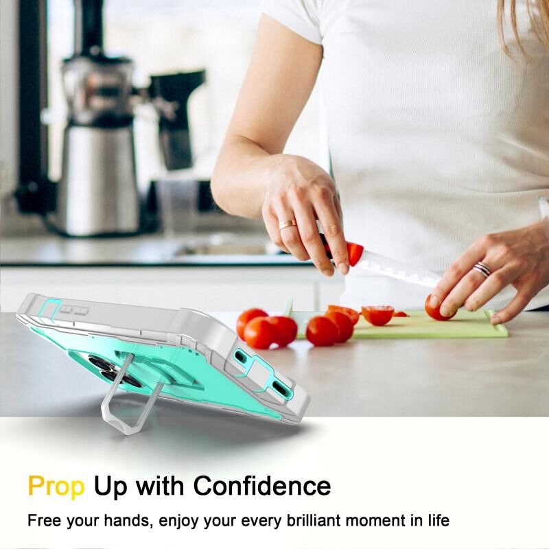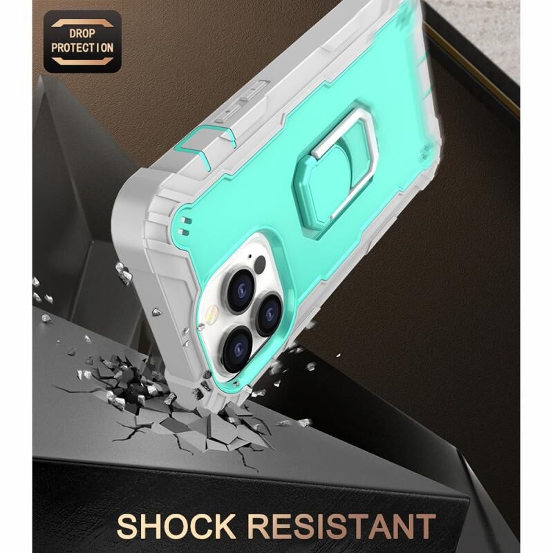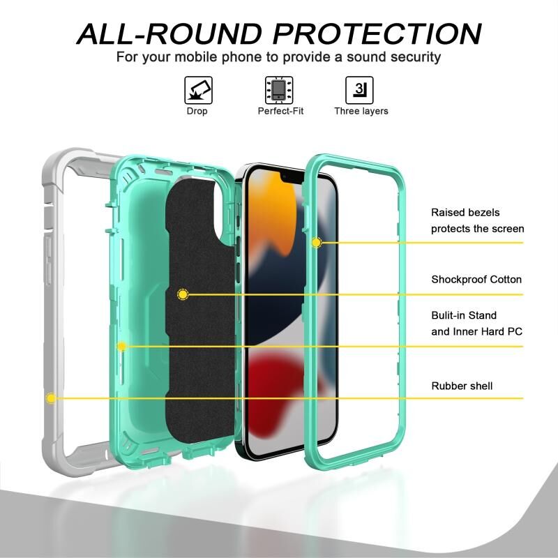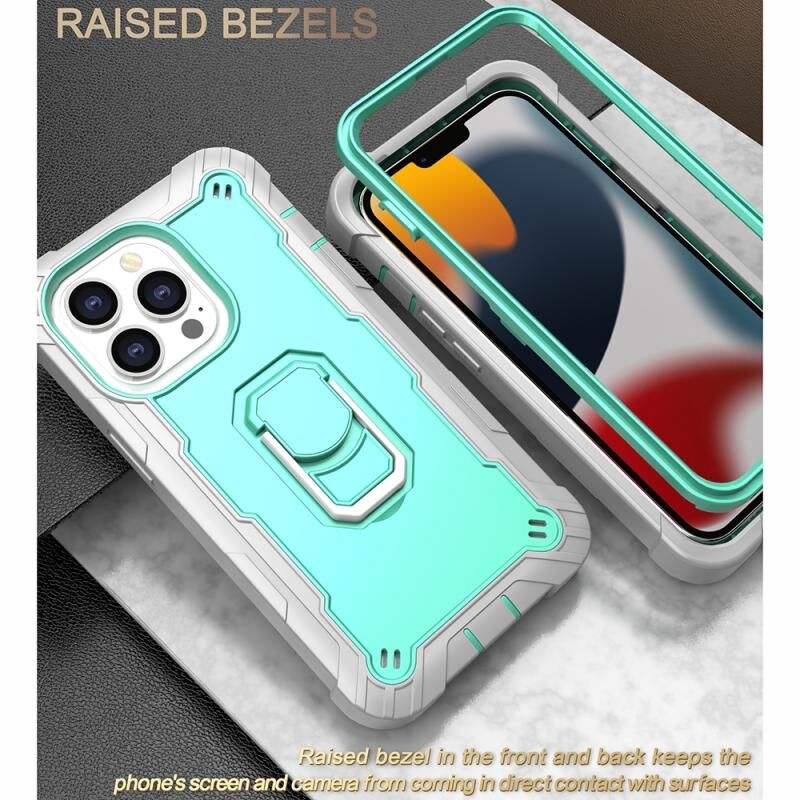 For iPhone 13 Pro PC + Rubber 3-layers Shockproof Protective Case with Rotating Holder (Grey White + Mint Green)
