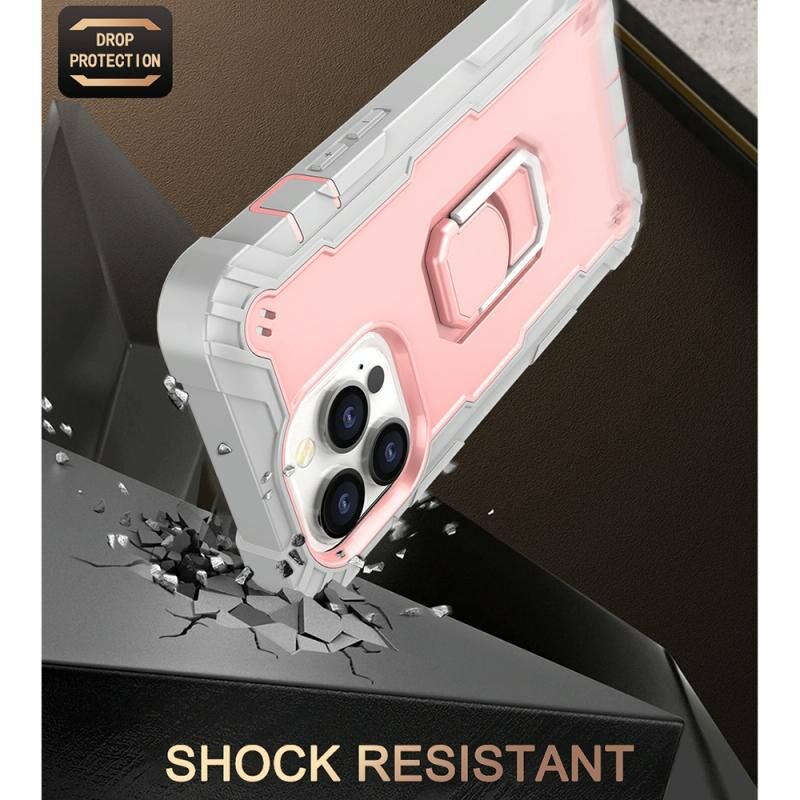 For iPhone 13 Pro PC + Rubber 3-layers Shockproof Protective Case with Rotating Holder (Grey White + Rose Gold)