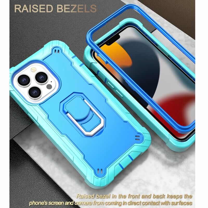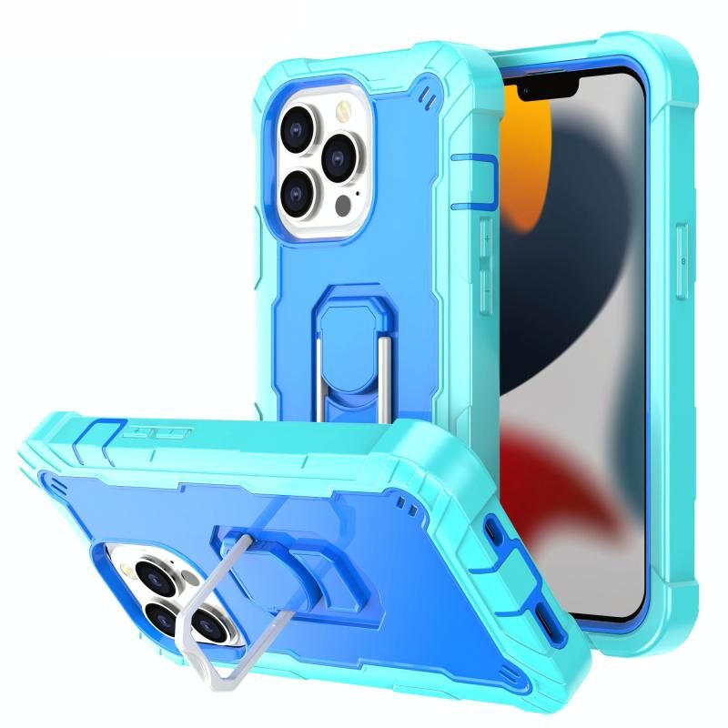For iPhone 13 Pro PC + Rubber 3-layers Shockproof Protective Case with Rotating Holder (Mint Green + Blue)