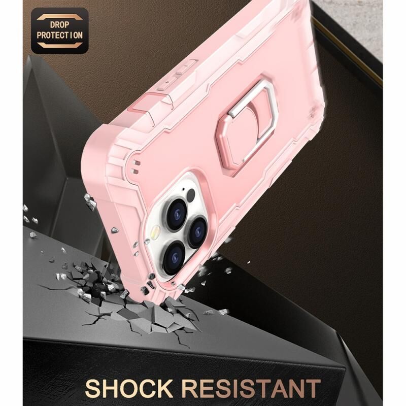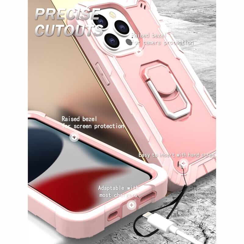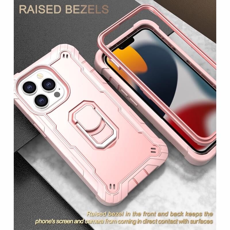 For iPhone 13 Pro PC + Rubber 3-layers Shockproof Protective Case with Rotating Holder (Rose Gold)