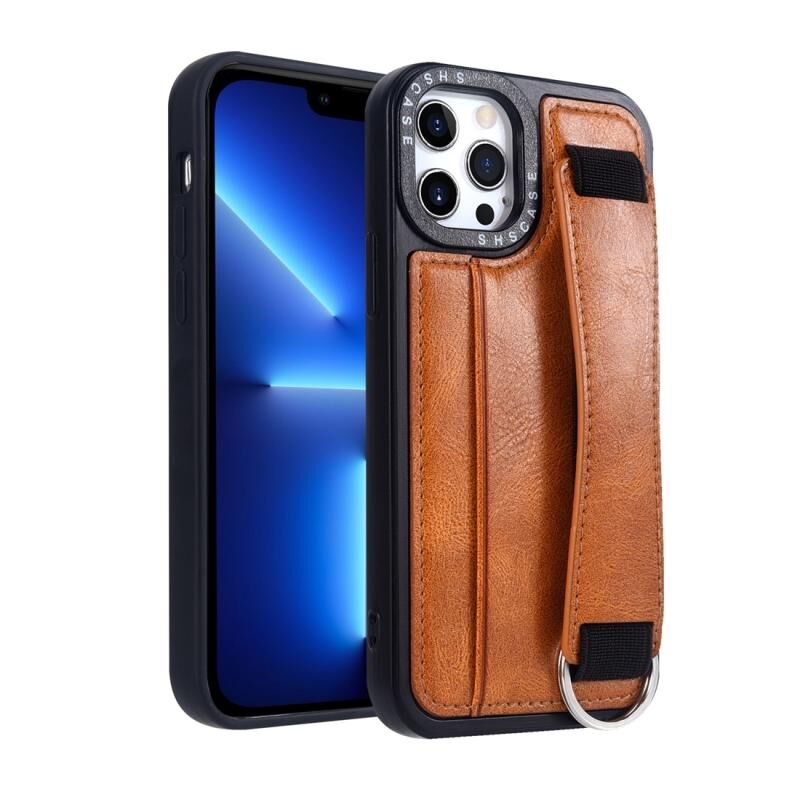 For iPhone 13 Pro Photo Frame Card Wallet Wrist Strap Holder Back Cover Phone Case(Brown)
