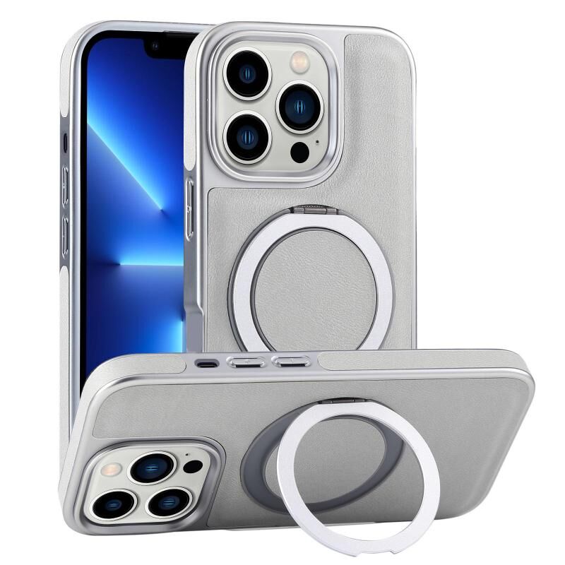 For iPhone 13 Pro Plated Leather Grain Rotation MagSafe Holder Phone Case(Grayish Green)