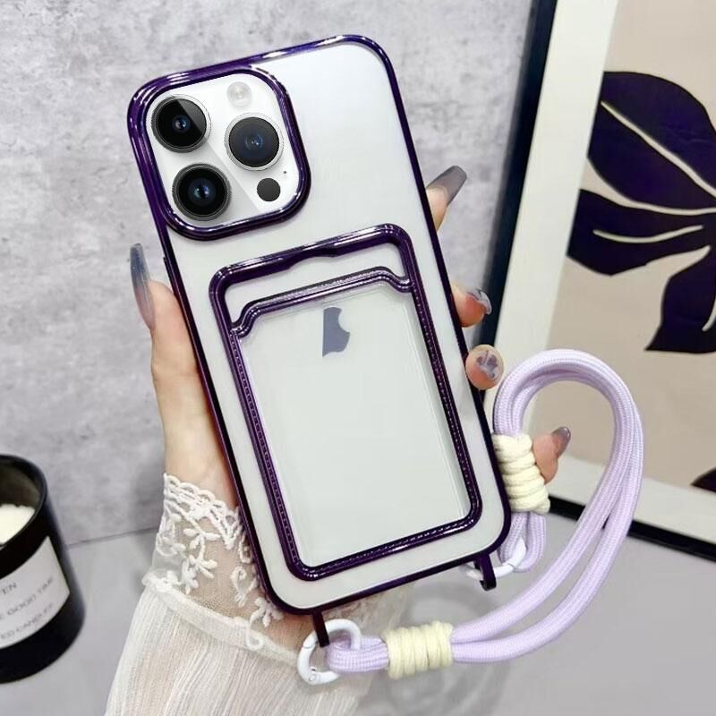 For iPhone 13 Pro Plating Clear TPU Phone Case with Card Slot & Strap(Purple)