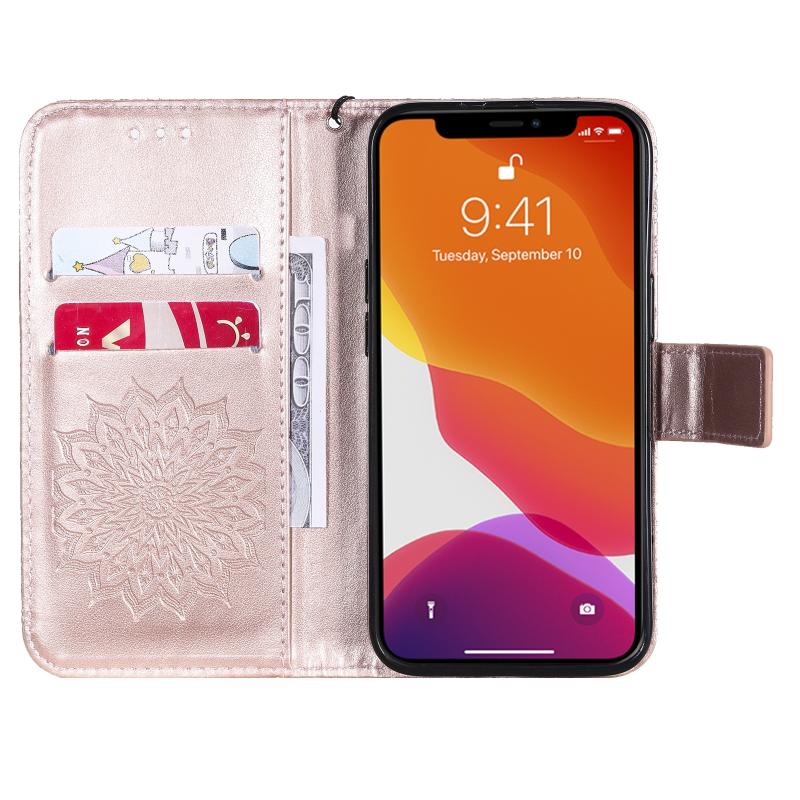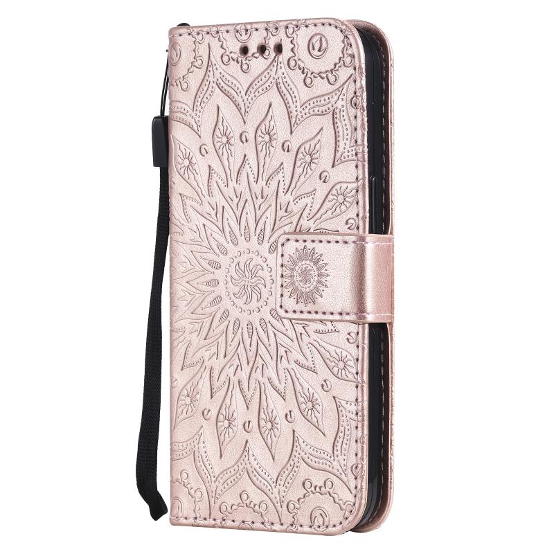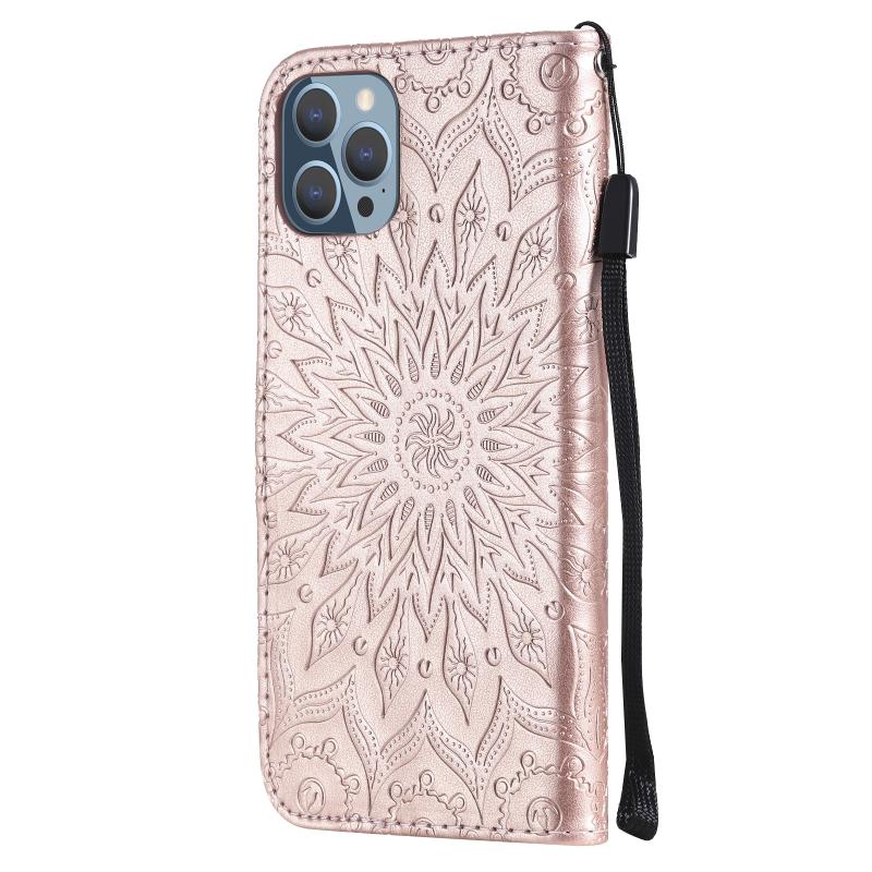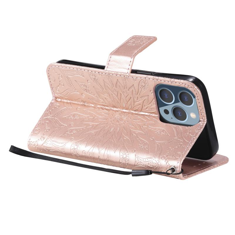 Θήκη για iPhone 13 Pro με εκτυπωμένο σχέδιο ηλίανθου, οριζόντια αναδιπλούμενη από δερματίνη PU, με θήκη για κάρτες, πορτοφόλι και λουρί (Χρυσό Ρόδινο).