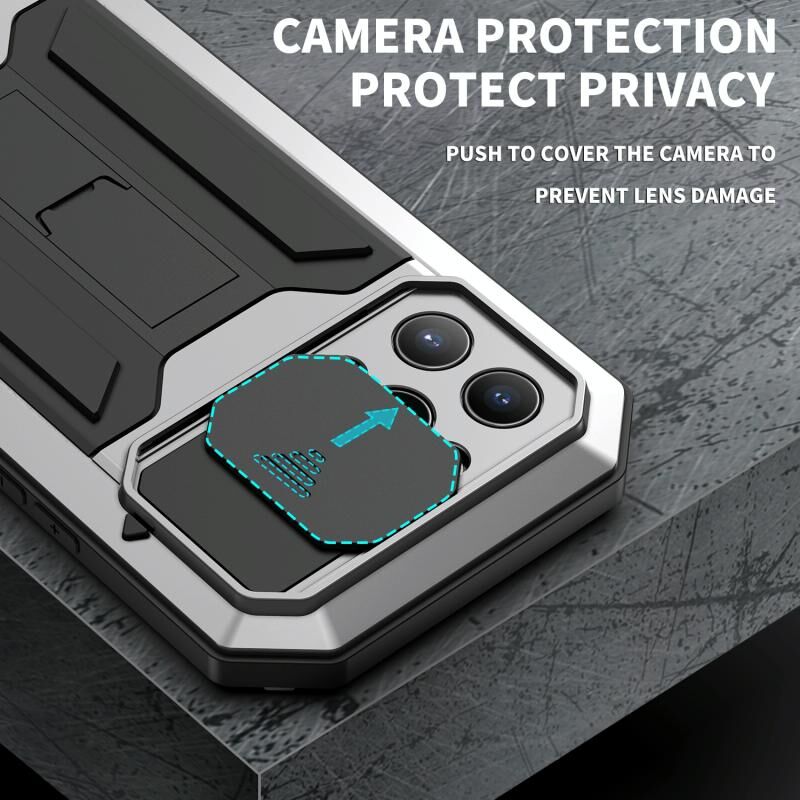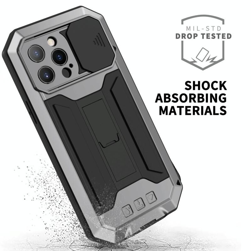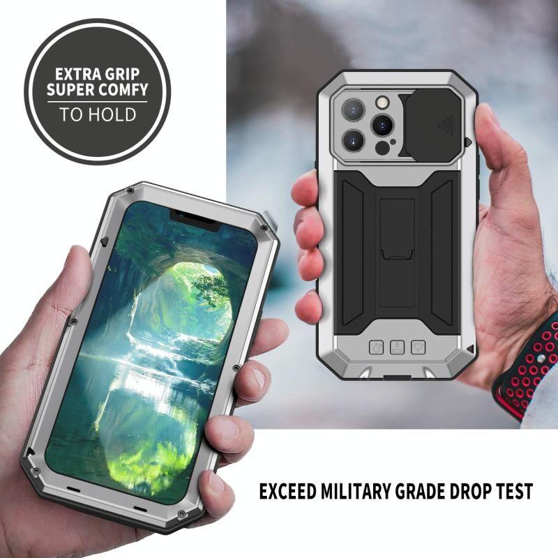 For iPhone 13 Pro R-JUST Sliding Camera Shockproof Life Waterproof Dust-proof Metal + Silicone Protective Case with Holder (Silver) (R-JUST)