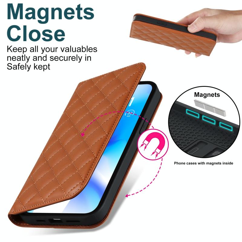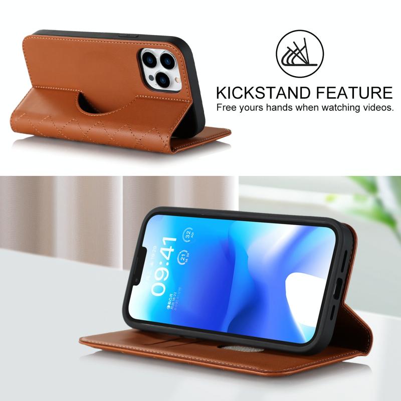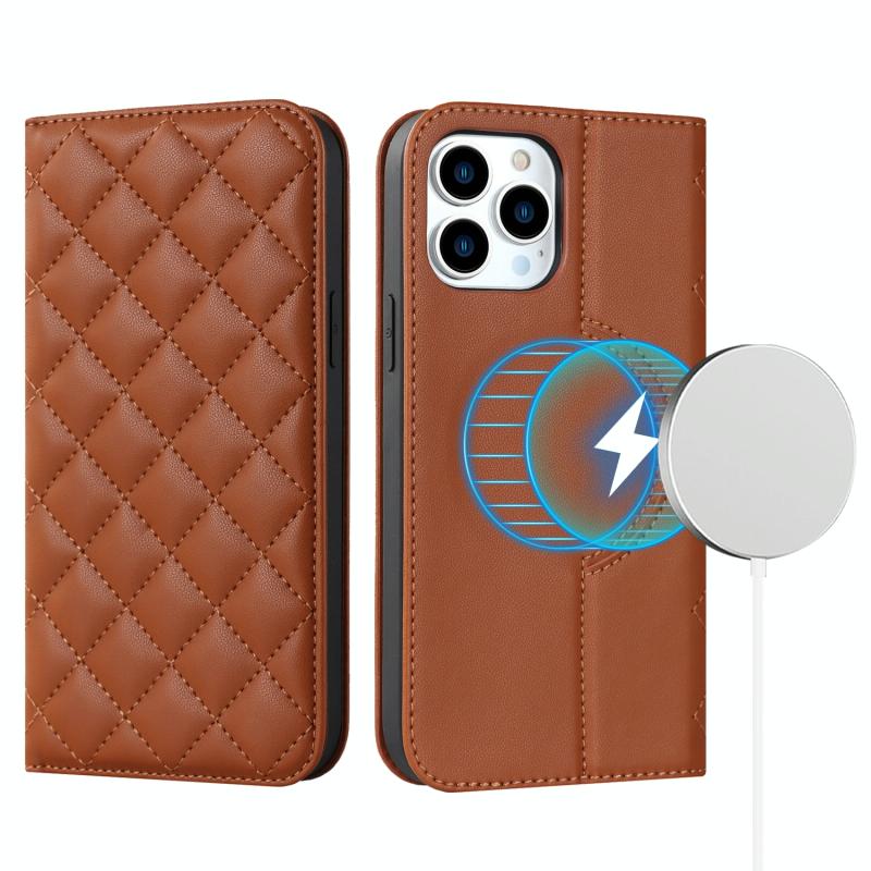 For iPhone 13 Pro Rhombic MagSafe RFID Anti-Theft Wallet Leather Phone Case(Brown)