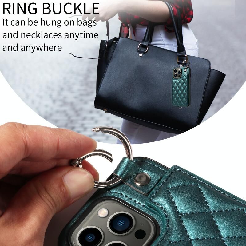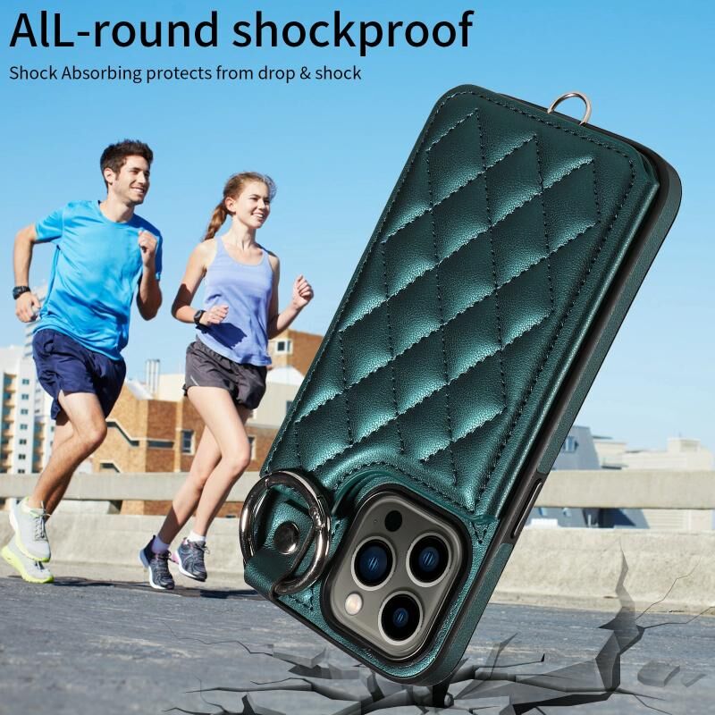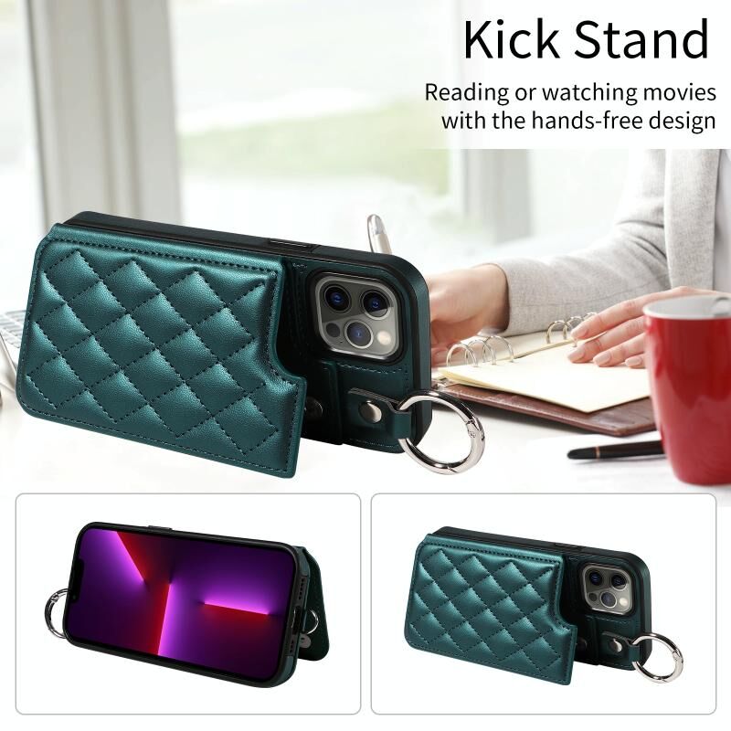 For iPhone 13 Pro Rhombic Texture Card Bag Phone Case with Short Lanyard(Green)