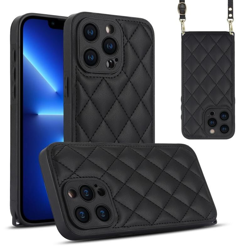 For iPhone 13 Pro Rhombic Texture Phone Case with Dual Lanyard(Black)