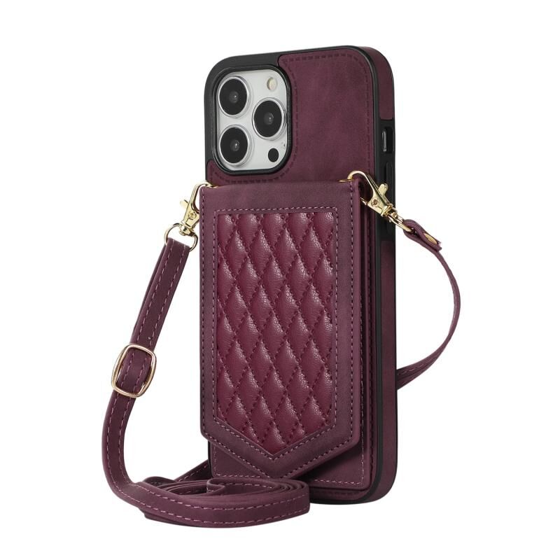 For iPhone 13 Pro Rhombic Texture RFID Phone Case with Lanyard & Mirror(Wine Red)