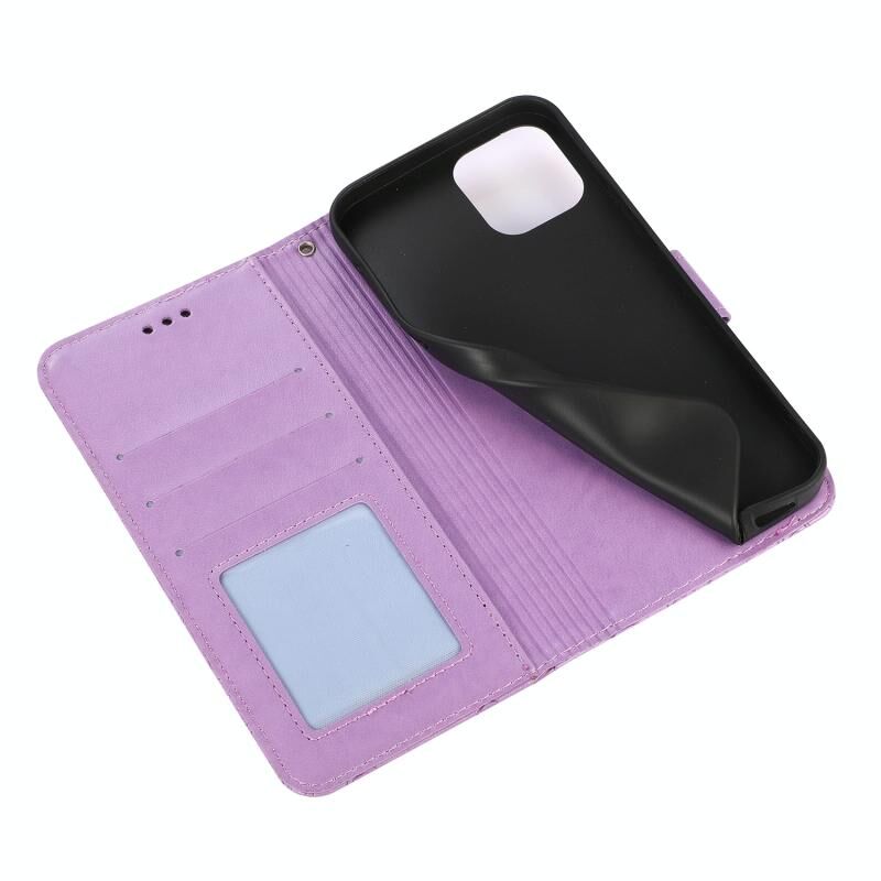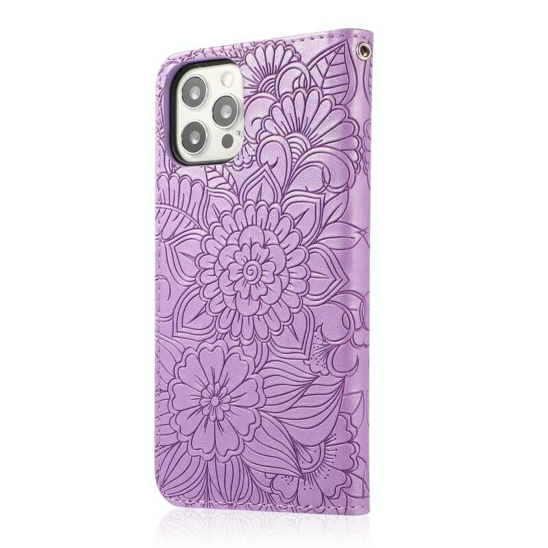 For iPhone 13 Pro Skin Feel Embossed Sunflower Horizontal Leather Case (Purple)