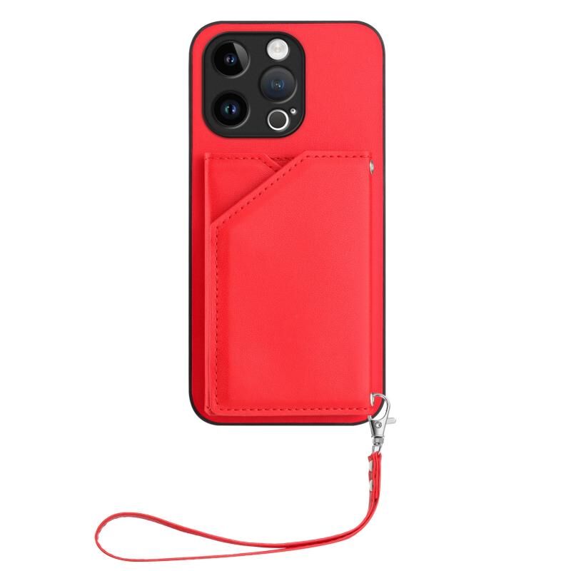 Θήκη τηλεφώνου για iPhone 13 Pro με αίσθηση δέρματος, τέσσερις θήκες για κάρτες και λουρί καρπού (Κόκκινο)