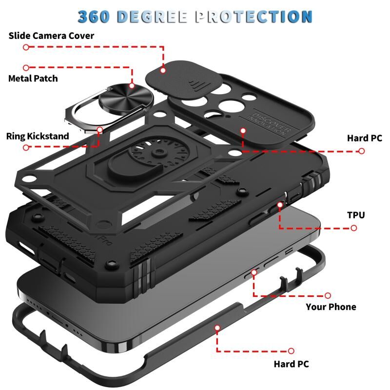 Θήκη προστασίας για iPhone 13 Pro με σχεδιασμό συρόμενου καλύμματος κάμερας, κατασκευασμένη από TPU + PC, με περιστρεφόμενη βάση 360 μοιρών & υποδοχή κάρτας (Λευκό+Μαύρο)
