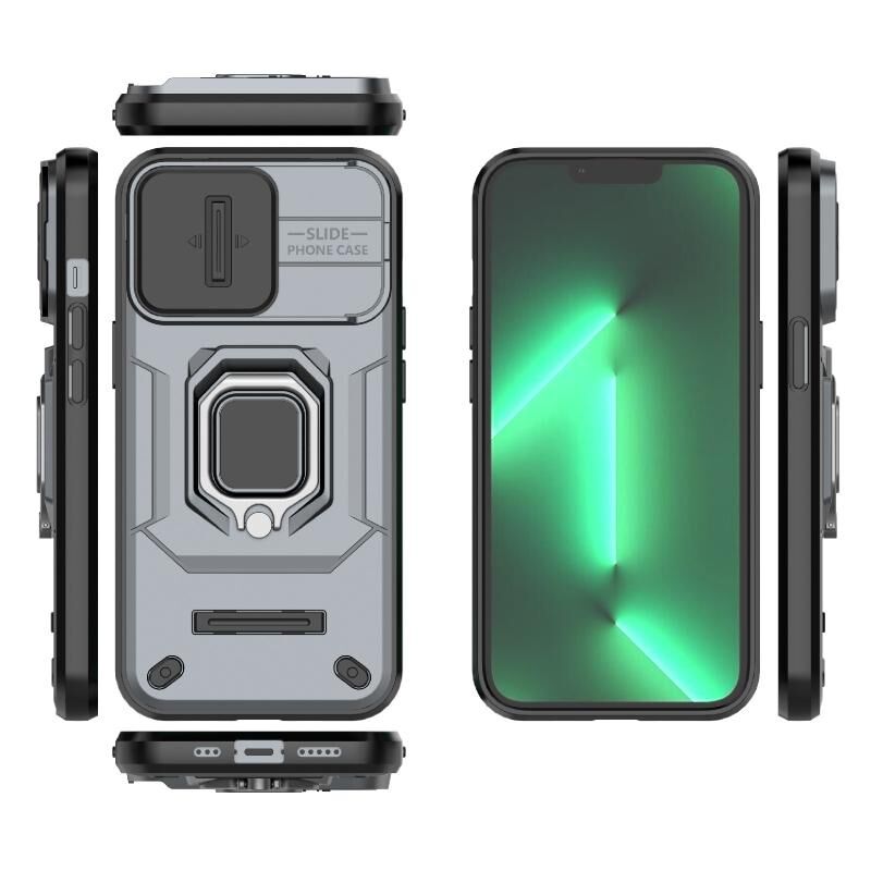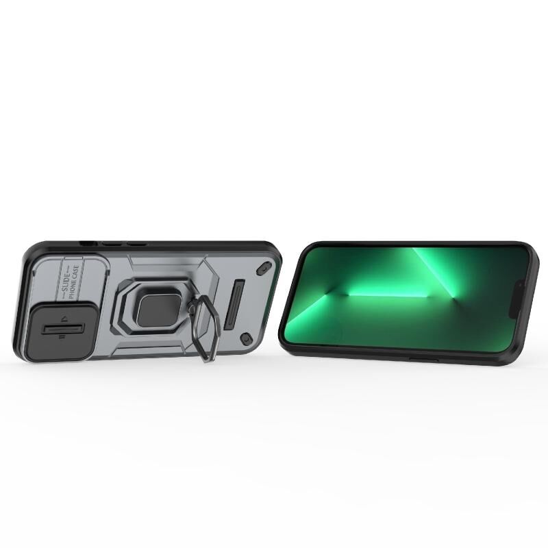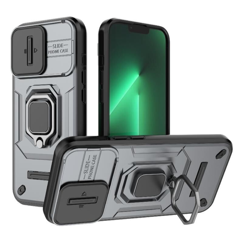 Θήκη κινητού τηλεφώνου για iPhone 13 Pro με ολισθαίνουσα προστασία κάμερας Camshield, κατασκευασμένη από TPU + PC, ανθεκτική σε κρούσεις, με βάση στήριξης (Γκρι)