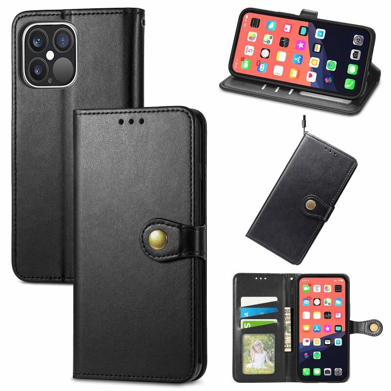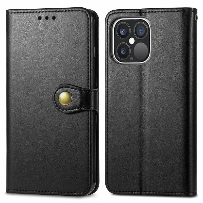 Θήκη τηλεφώνου για iPhone 13 Pro από δέρμα με μονόχρωμο χρώμα και αγκράφα, με κορδόνι, κορνίζα φωτογραφιών, θήκη για κάρτες, πορτοφόλι και λειτουργία βάσης (Μαύρο)