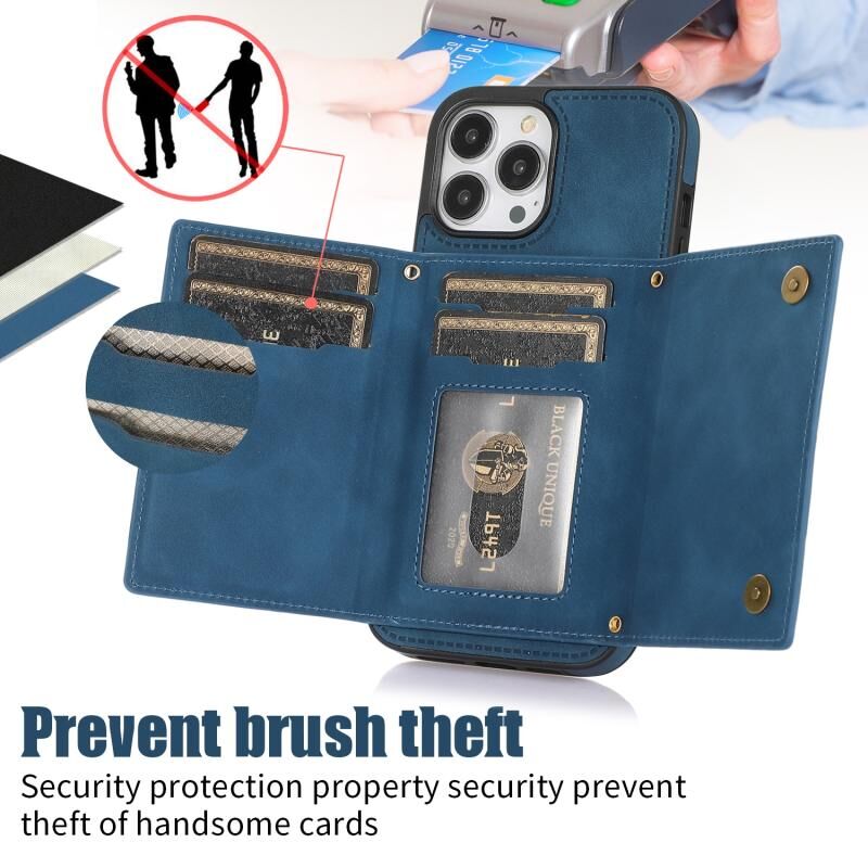 Θήκη τηλεφώνου από δέρμα με προστασία RFID για iPhone 13 Pro, τριπλή, με κορδόνι (Μαύρο)