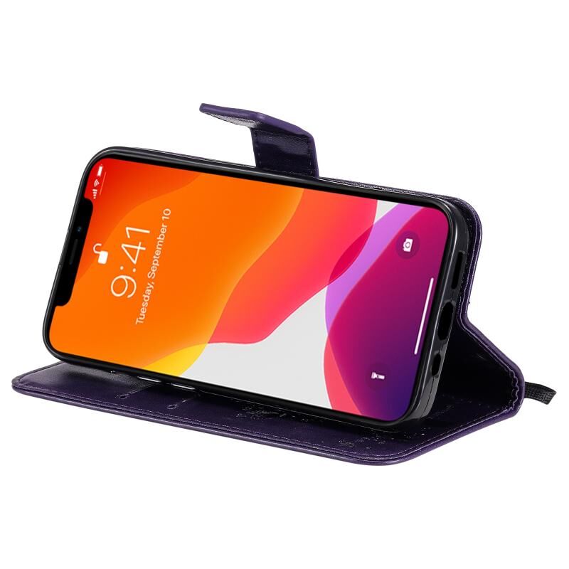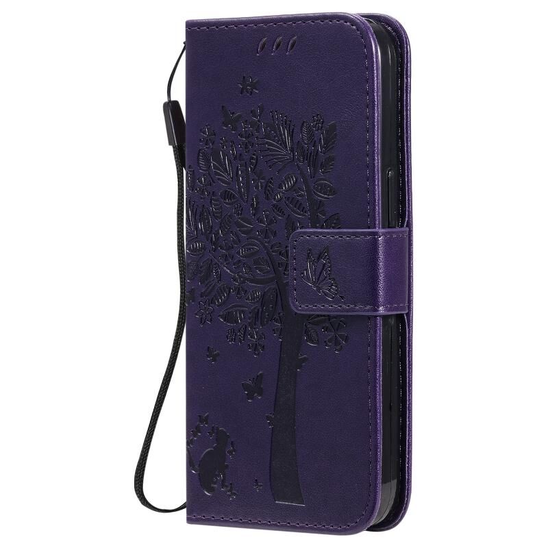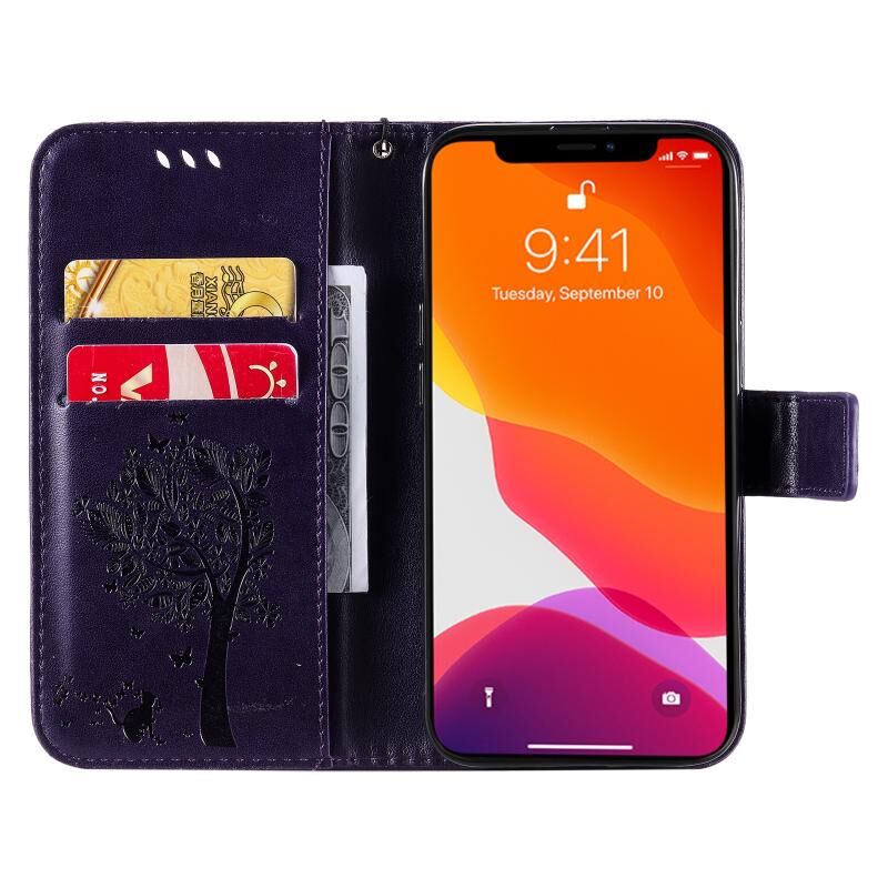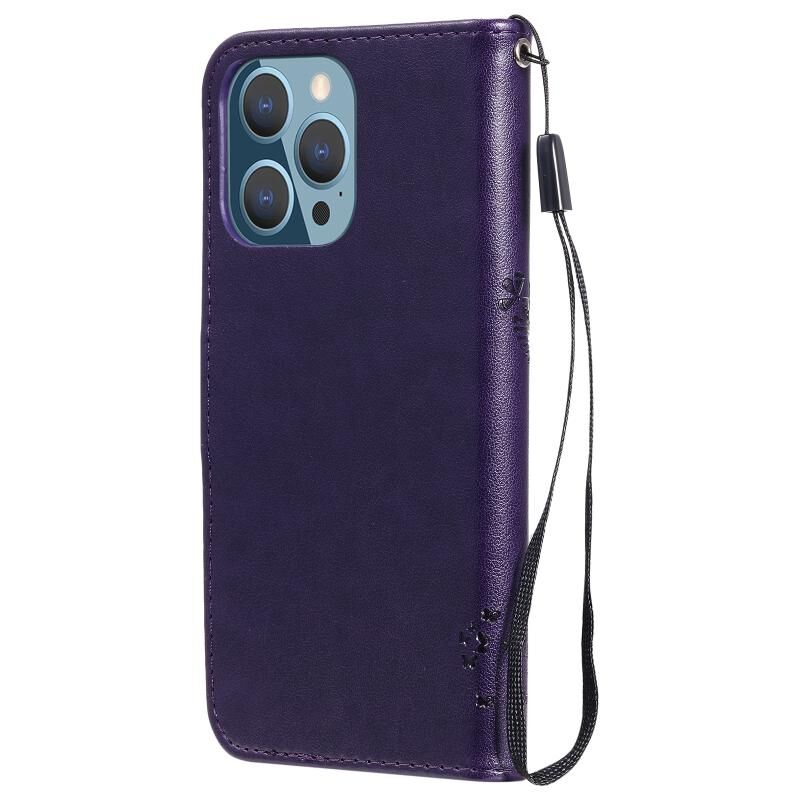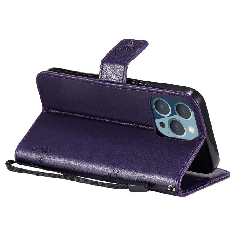 For iPhone 13 Pro Tree & Cat Pattern Pressed Printing Horizontal Flip PU Leather Case with Holder & Card Slots & Wallet & Lanyard (Purple)
