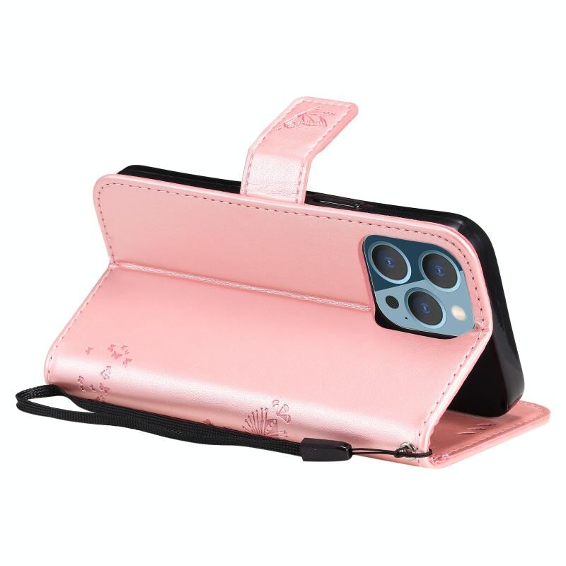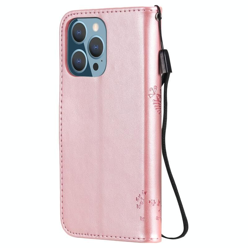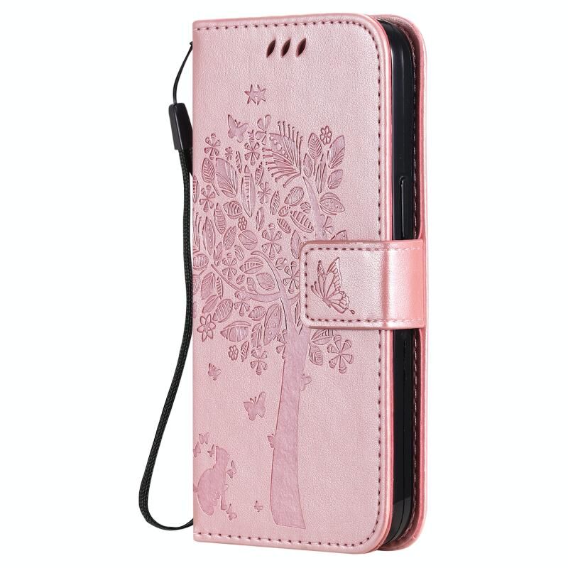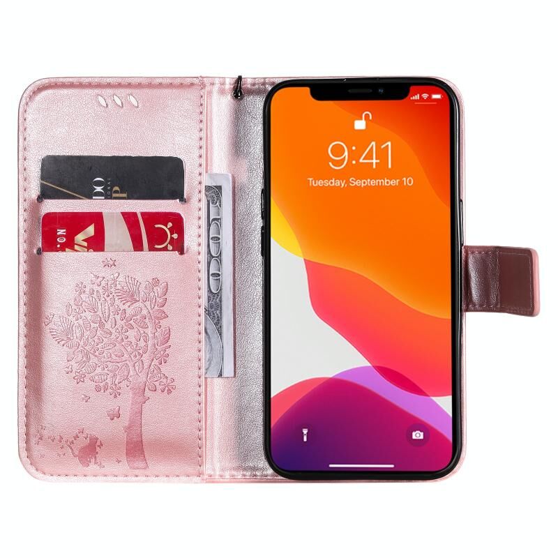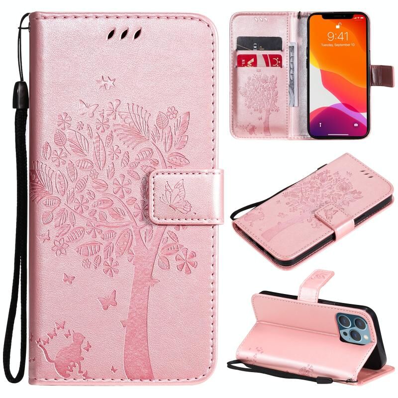 For iPhone 13 Pro Tree & Cat Pattern Pressed Printing Horizontal Flip PU Leather Case with Holder & Card Slots & Wallet & Lanyard (Rose Gold)