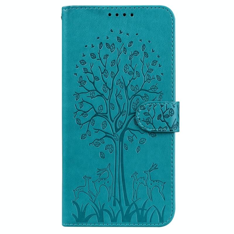 For iPhone 13 Pro Tree & Deer Pattern Pressed Printing Horizontal Flip Leather Phone Case (Blue)