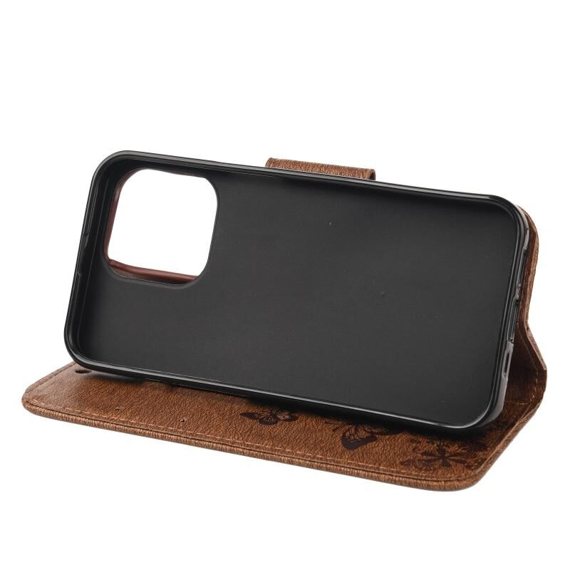 Θήκη για iPhone 13 Pro, vintage, ανάγλυφη, με floral σχέδιο και πεταλούδες, οριζόντια, από δέρμα με θήκη για κάρτες, στήριξη, πορτοφόλι και λουρί (Μαύρο)