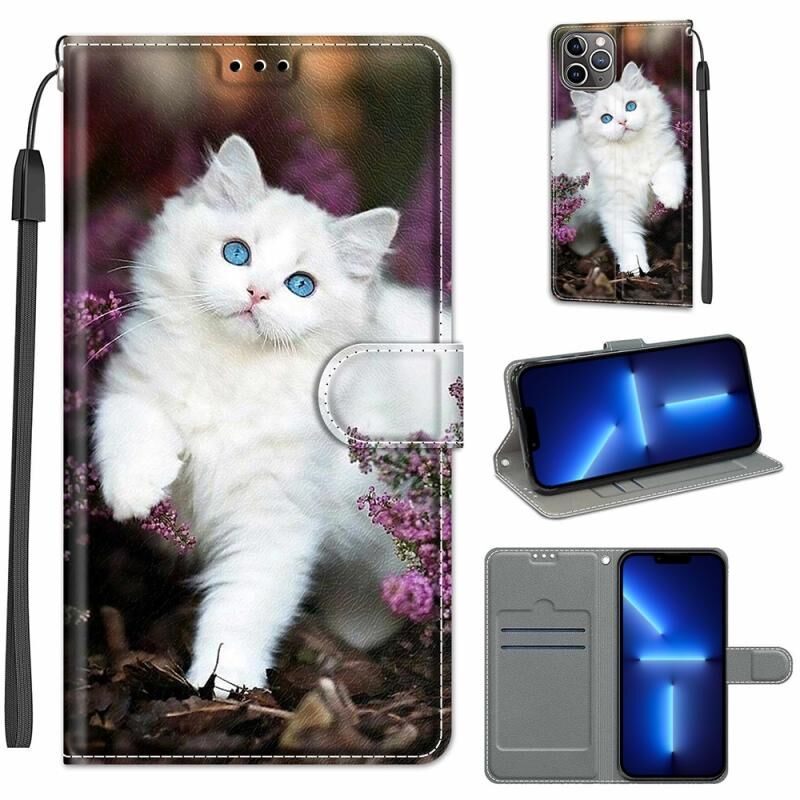 For iPhone 13 Pro Voltage Colored Drawing Magnetic Clasp Horizontal Flip PU Leather Case with Holder & Card Slots (C08 Flower Bush Big White Cat)