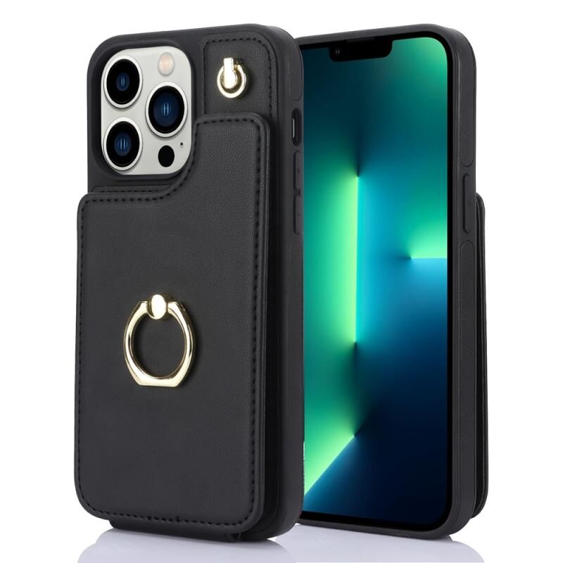 For iPhone 13 Pro YM005 Skin Feel Card Bag Phone Case with Long Lanyard(Black)