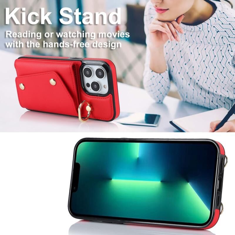For iPhone 13 Pro Zipper Card Bag Phone Case with Dual Lanyard(Red)