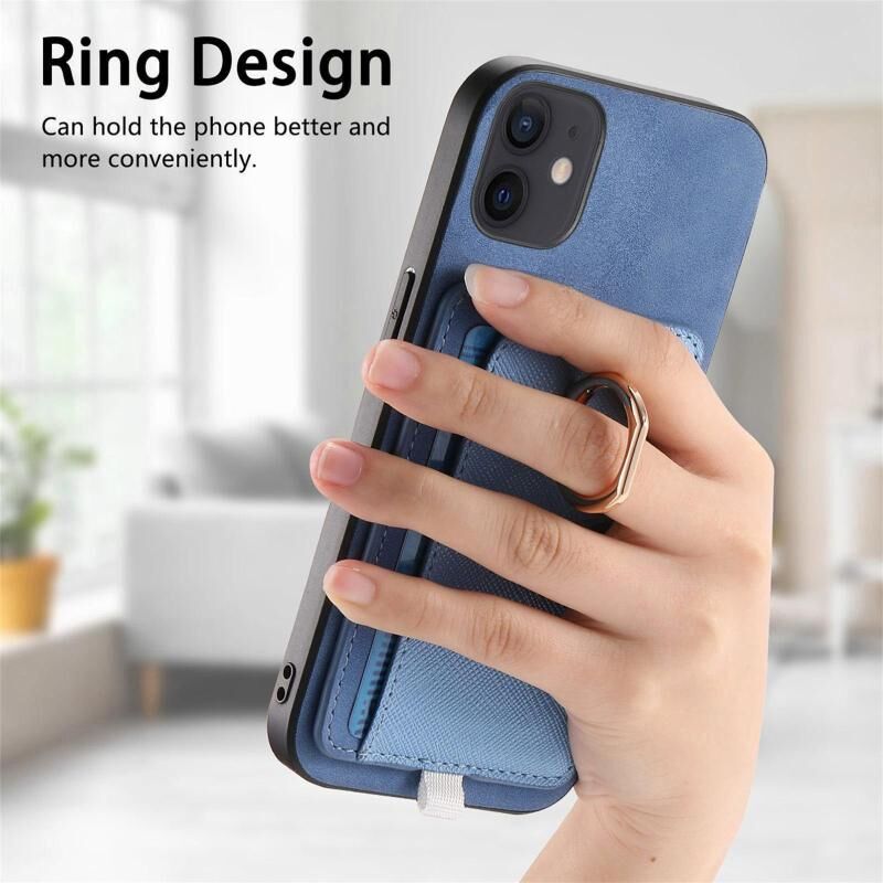 For iPhone 13 Retro Cross Leather Ring Side Insert Card Bag MagSafe Phone Case(Blue)